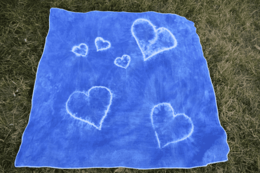 Five hearts decorate this blue baby blanket, which can also be used as a neckerchief. It has been dyed in an organic indigo dye, that gives it this beautiful and deep blue.