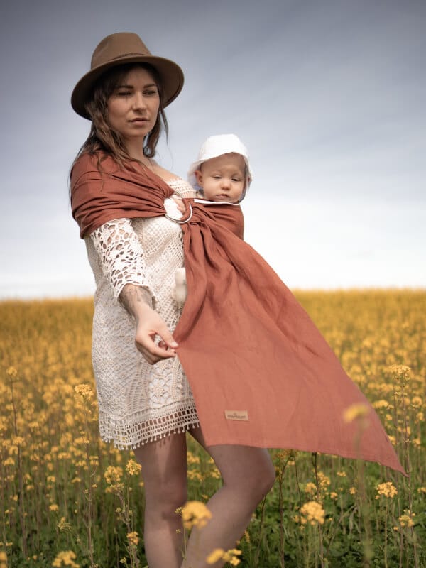 Warm, earthy aesthetics like terracotta and a lively little creature inside. This is our Squirrel Ring Sling: