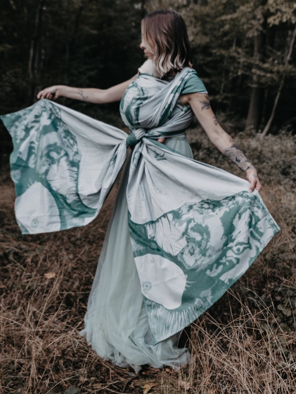 Dans le cas de notre porte-bébé éléphant en coton, chaque taille individuelle a déjà été créée lors du processus de tissage, de sorte que deux grandes têtes d’éléphant peuvent orner les extrémités. Chacune de vos variations de portage noué devient ainsi un véritable point fort. Le centre de l’écharpe est décoré de la fleur de mariblum. Elle n’est pas non plus cousue, mais tissée sous forme de motif jacquard.