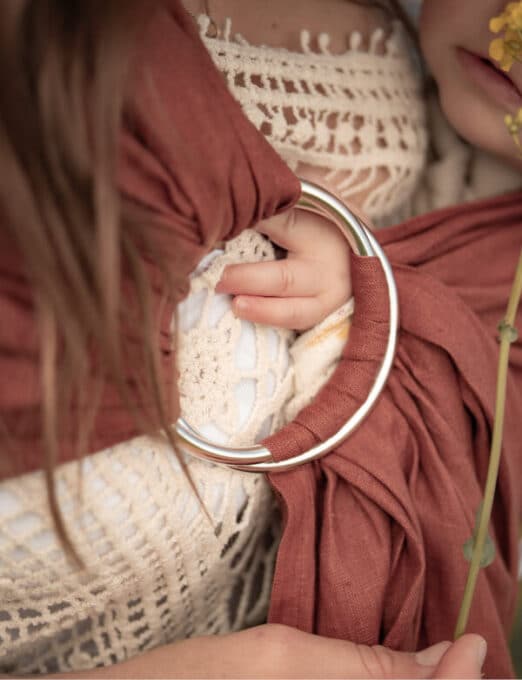 Un Ring Sling è una fascia corta con due anelli robusti cuciti a un’estremità. Il tessuto viene infilato attraverso gli anelli e si adatta così individualmente a te e al tuo bambino. Diversamente dalle fasce tradizionali, qui non serve fare nodi – rendendolo velocissimo e semplice da usare.